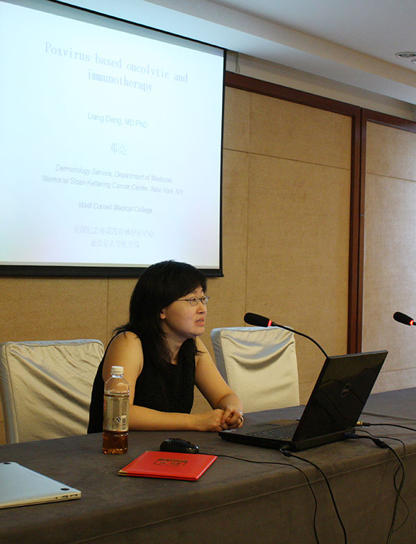 鄧教授作了題為“Poxvirus-Based Oncolytic & Immunotherapy (痘病毒治療癌癥的機理)”的學術報告,簡述痘病毒在癌癥免疫治療中的重要作用。結合藥物治療,該方法對于皮膚腫瘤殺滅率達25%以上,突破了傳統的腫瘤治療局限性,顯著提高了患者存活率,應用前景光明。我所科技工作者對此產生了濃厚興趣,爭相提問,積極交流。