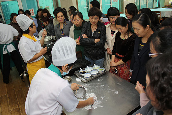 活動邀請了食堂工作人員教大家學做家常菜肴(生抽蝦、耗油牛肉、酸菜魚片)和家常點心(壽司卷、南瓜餅、刀切饅頭、蘿卜絲團子)。師傅們首先介紹了烹飪要點、營養價值、制作要訣及基礎知識,然后一邊講解制作方法,一邊現場操作。職工們聚精會神地看著每一個準備、制作過程,在講到要領時還不時拿出手機進行拍攝,有人還親自動手參與制做。