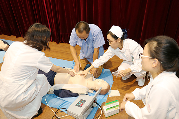 此次培訓通過理論授課、觀看視頻、現場演示及手把手指導等方式進行。培訓老師通過PPT詳細解讀了新版心肺復蘇的基本原則、操作規范、方法及步驟,用生動、形象的語言,將大家帶到一個身臨其境的急救現場。接著操作老師在現場為大家詳細演示了操作要領:判斷是否喪失意識、判斷有無自主呼吸、判斷有無脈搏,進行胸外心臟按壓,清理口腔異物,人工呼吸等。實際操練環節,在培訓老師的現場指導、點評和糾正下,大家對每一個急救環節都進行了模擬操作和反復練習。通過培訓,強化了職工的現場急救意識,掌握了心肺復蘇的操作要領,起到了良好的醫學急救知識科普教育效果。(團委 滕芬)