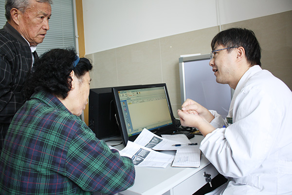 查好房后,在去往二樓外科專家門診的電梯里,朱主任才有空告訴筆者為什么要首先看看術(shù)后患者的傷口引流管,管子里體液的量和色能直觀地反映傷口內(nèi)部是否發(fā)生了異常出血,及早發(fā)現(xiàn)、排除患者遭遇術(shù)后喉痙攣而窒息的風(fēng)險。“最大的風(fēng)險在術(shù)后,所以我們要管理好患者的所有狀況。”話剛落音,電梯門開,一種烏泱泱的人群升騰出的喧囂聲音讓人感受到二樓專家門診區(qū)到了,眼尖的患者說“朱主任來了”。小心穿過人群,輕開診室門,朱主任一邊身體落座一邊雙手打開第一位患者的病歷本,帶著笑意,注視著患者,還是那樣輕柔地問:“是怎么不舒服啊?”。得到回答后,朱主任仔細(xì)用手檢查了患者的脖頸上甲狀腺處,溝通了一些病情,告訴患者需要驗血和做B超看看,在電腦系統(tǒng)里操作好后,他看著患者說“三樓繳費,三樓檢查,做好再回來”。這是一位患者與醫(yī)生問診的全部,卻只是朱主任這一天里100多次問診的一個片段。絕大部分患者取到檢查報告單之后還需要再次商討病情、開具處方,“3個月(或6個月或1年)后來復(fù)查一下”、“少吃海帶、紫菜和海蜇頭這些含碘食物”、“空腹、一次2粒半”等等這樣的叮囑(筆者注:醫(yī)囑因人而異,上述僅作舉例)和解釋計不清重復(fù)了多少遍。
